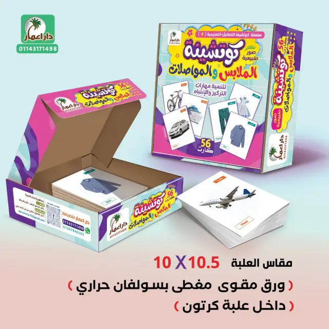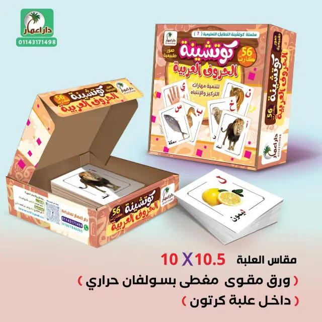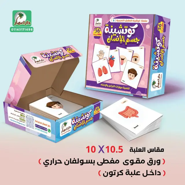 وعلاوة على ذلك، تحتوي الكروت على الأسماء مكتوبة بالعربي والإنجليزي، مما يساهم في تنمية الحصيلة اللغوية لدى الطفل.